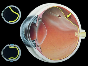 - Расслоение сетчатки. Стойкое повышение внутриглазного давления приводит к тому, что сетчатка отслаивается от места своего прикрепления.