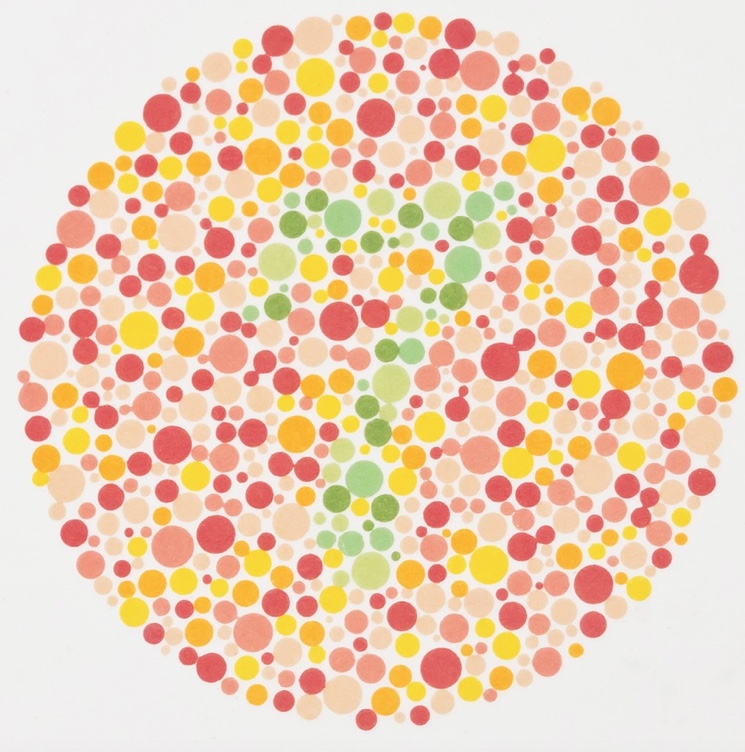 Эта картинка из цветных точек позволяет провести тест на дальтонизм. У дальтоников отсутствует 1 из 3 видов колбочек, различающих красный, зеленый и синий цвета. Чаще всего дальтонизм не различают красные и зеленые цвета.
